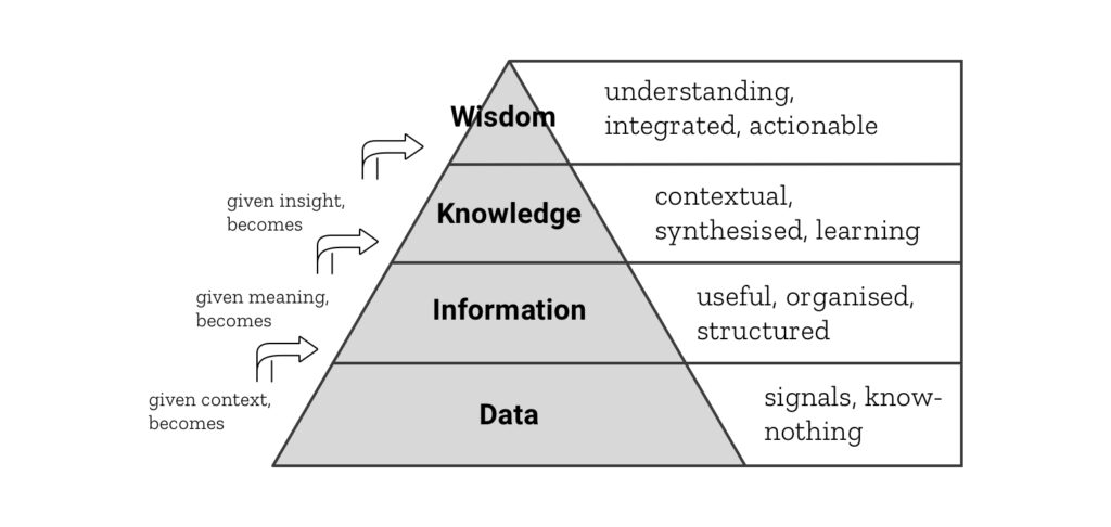 Let me first clarify some distinctions between data, information, knowledge and wisdom. I'll use the well established DIKW Pyramid.
